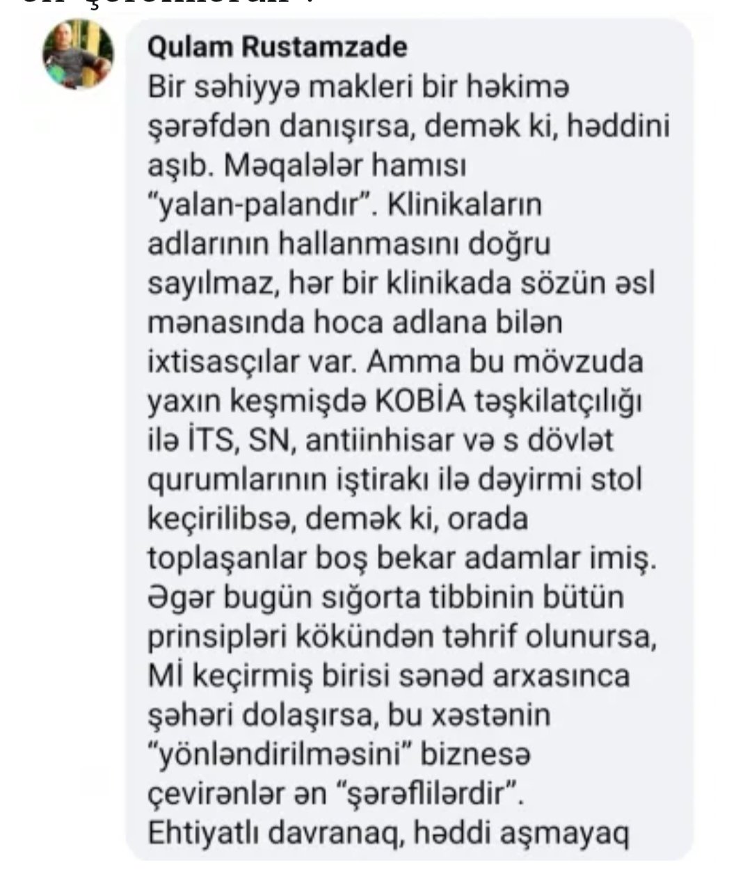 Yeni Klinikanın direktoru Barat Yusubov sosial şəbəkədə həmkarlarına qarşı sərt ifadələr işlədib.